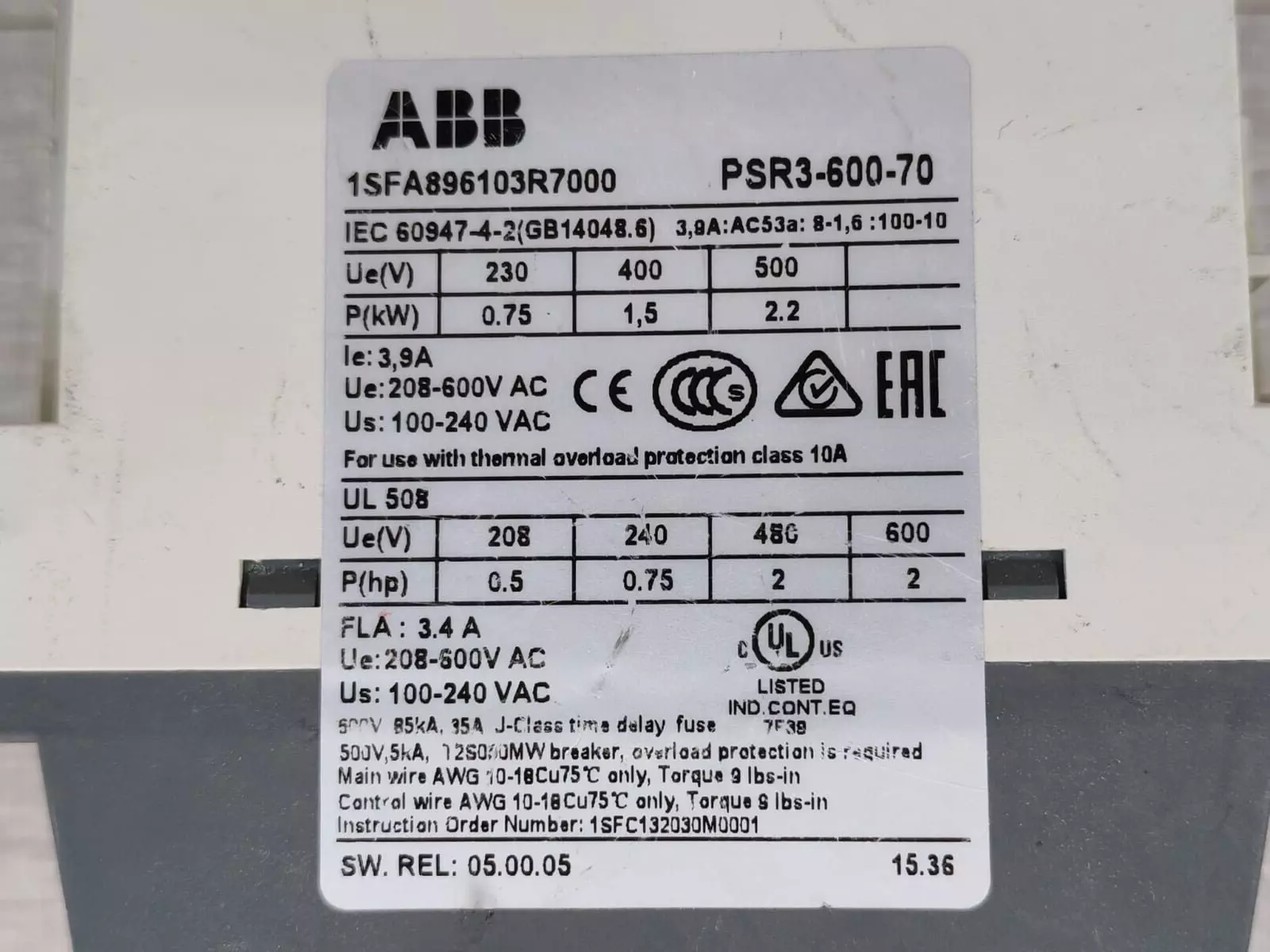 USED ABB PSR3-600-70 SOFT STARTER 1SFA896103R7000-TESTED OK