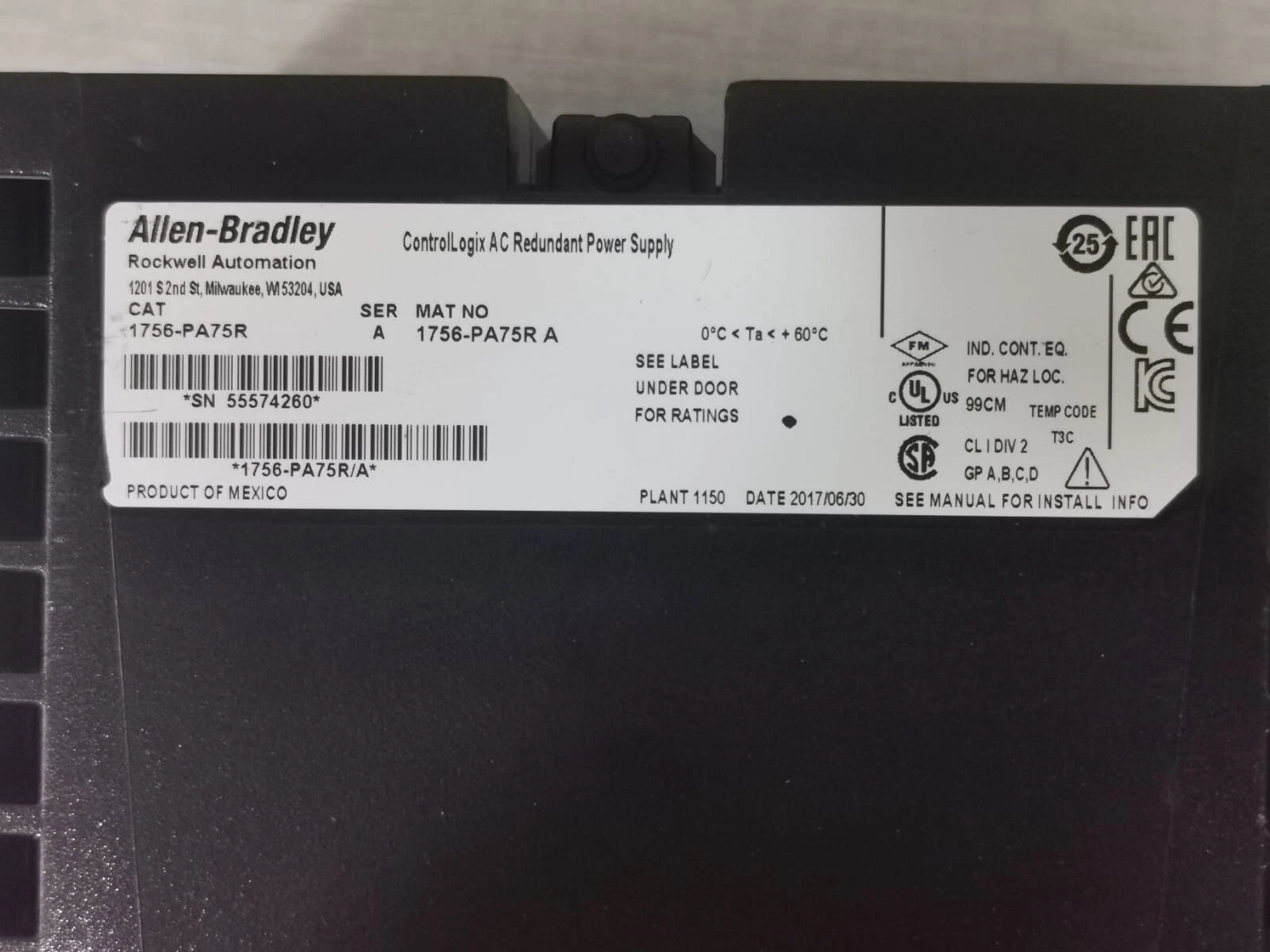 Used ALLEN-BRADLEY 1756-PA75R/A Ser. A CONTROLLOGIX AC REDUNDANT POWER SUPPLY - Orbit Surplus