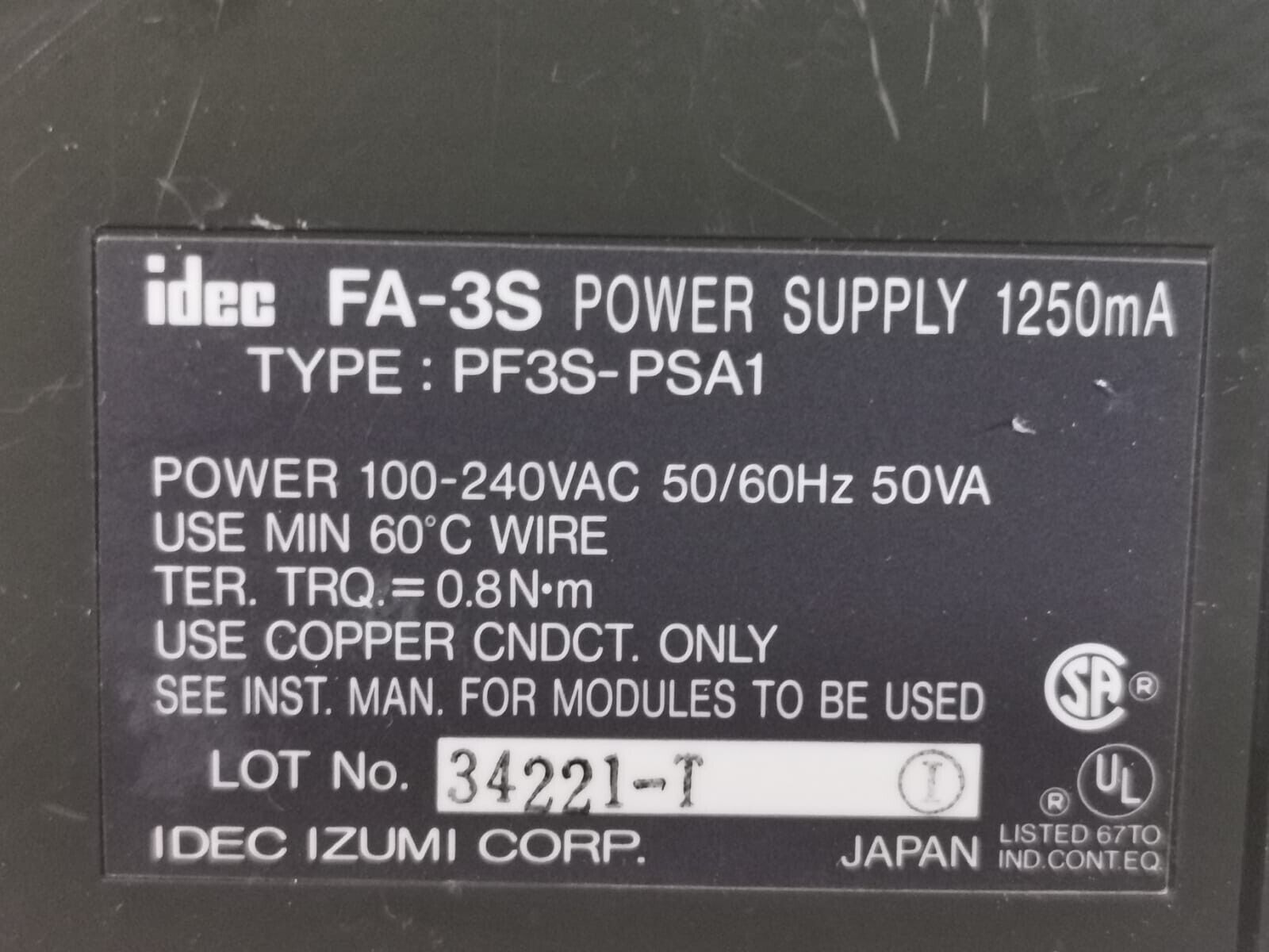 USED IDEC FA-3S POWER SUPPLY PF3S-PSAI- WITHOUT COVER